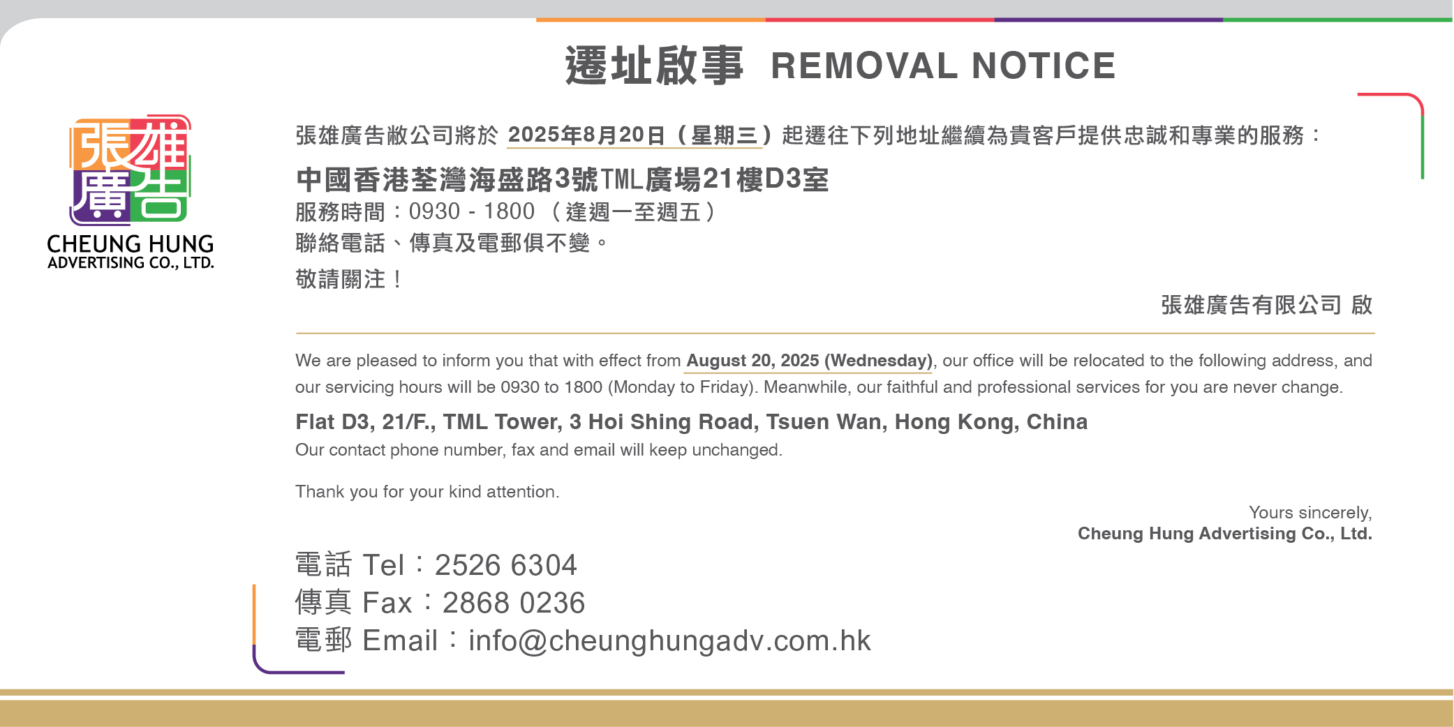 張雄廣告有限公司成立於1990年,我們紮根於香港,為您提供各類型廣告媒體、市場推廣、多媒體策劃、以及公關等全方位宣傳服務。